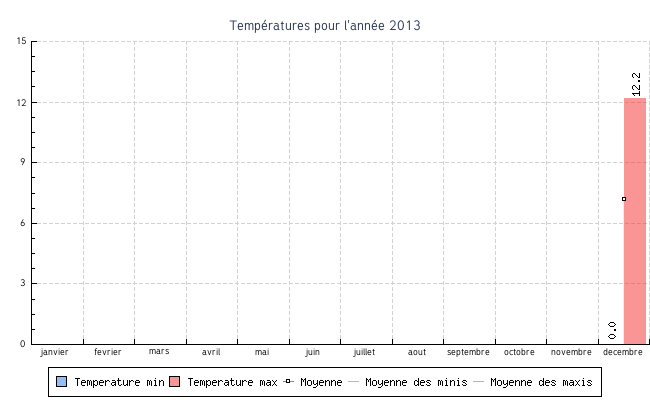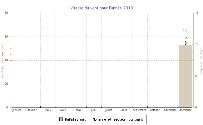 | decembre | 0.0 °C | 4.2 °C | 12.2 °C | 8.9 °C | 7.2 °C | 12.9 km/h | 52.6 km/h | SSO |
